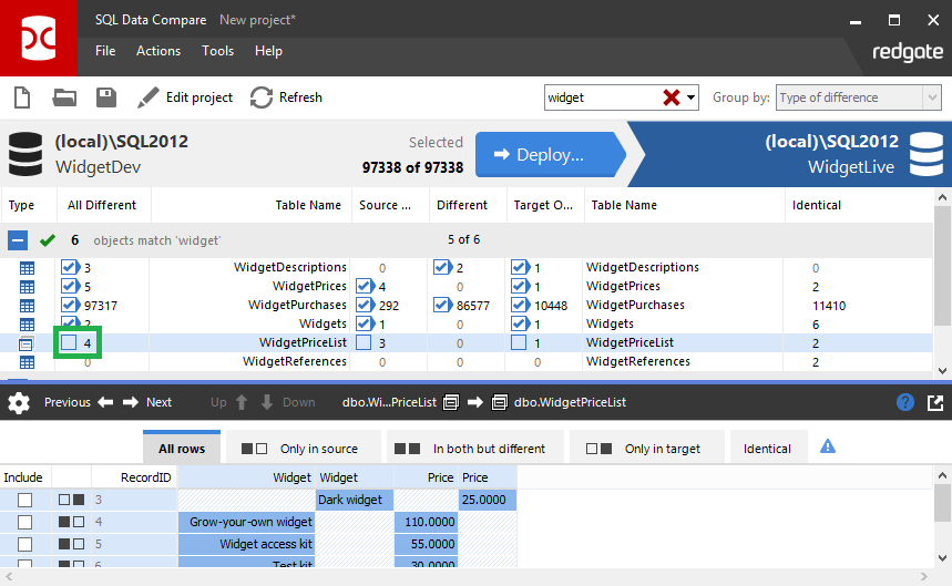 In this example WidgetID is the comparison key , used by SQL Data Compare to match rows in the two databases.