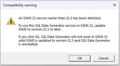 - It will not work in SSMS 22 until SSMS is updated to 22.3 and SQL Data Generator is reinstalled