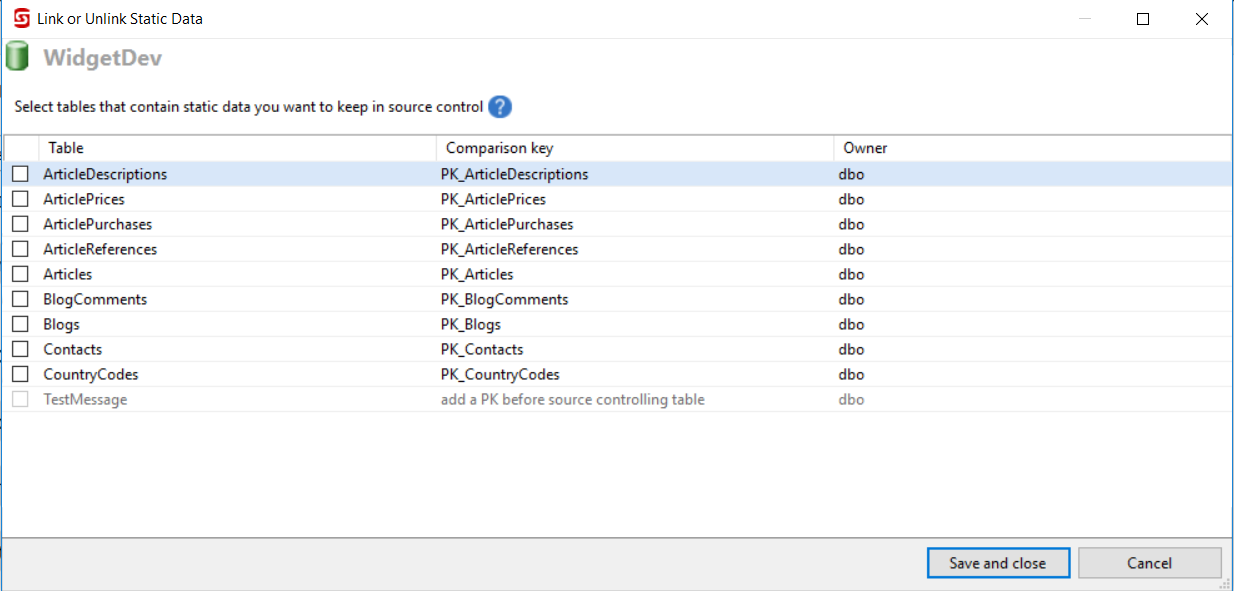 You can only source-control data in tables with a valid primary key (including using only PK capable datatypes). The primary key is used as the comparison key to identify corresponding rows. - Select the tables you want to link.