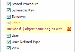 You can exclude object types using the check boxes in the left-hand pane, or build more complex conditions by specifying AND clauses and OR conditions in the right-hand pane.