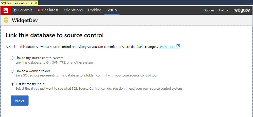In SQL Source Control, on the Setup tab, select Just let me try it out and click Next: