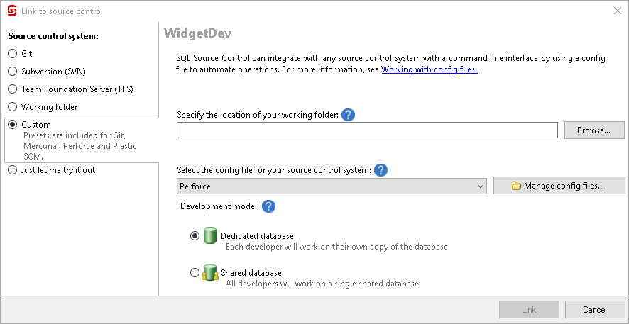 - In SQL Source Control, on the Setup tab, make sure Link to my source control system is selected and click Next.