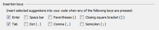 Insertion keys are the keys that insert the currently selected suggestion into your code: