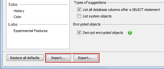 You can import and export all your SQL Prompt options using the buttons at the bottom of the Options dialog box: