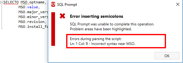 If SQL Prompt wasn't able to format your code, a pop-up window will be displayed showing the reasons: