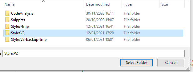 5. Change the selected style folder by clicking the three dots next to the current style folder in the style editor window, and select the just-created "StylesV2" folder.