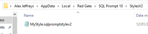 In version 10.5 of SQL Prompt, the format of the files used to store files was changed. The old styles will be updated to the new format when first running SQL Prompt after upgrading, but if you have already upgraded and have files in the old format (with file extension sqlpromptstylev2) you can use the following steps to update them to the new format.