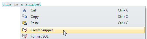 You can create a snippet from code you've typed into the query editor. Highlight the block of code, right-click and select Create Snippet.