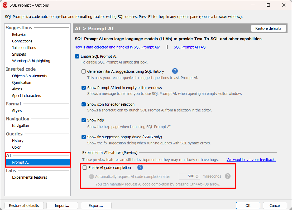 To enable AI code completion in your query editor, go to the SQL Prompt Options menu and in the Prompt AI menu under the AI section, and tick the checkbox “Enable AI code completion” to activate it. To disable it you can untick the same checkbox.