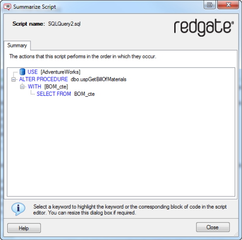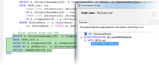 With SQL Prompt, you can view a summary of the actions that a SQL script performs, in the order in which they occur.