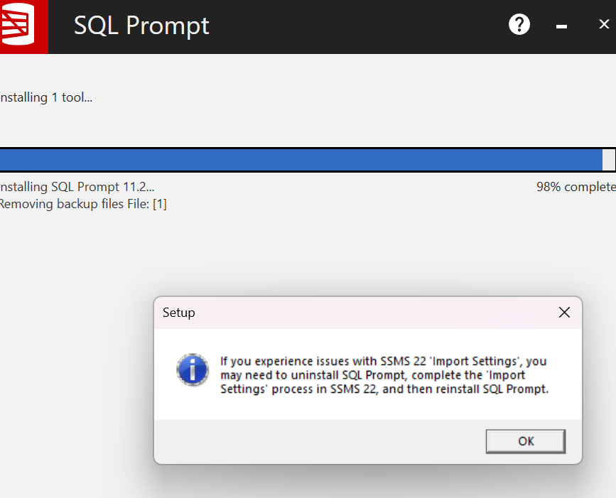 While importing settings from SSMS 21 (or older versions) into SSMS 22, SSMS freezes on the import screen and does not proceed if SQL Prompt is present on the machine.