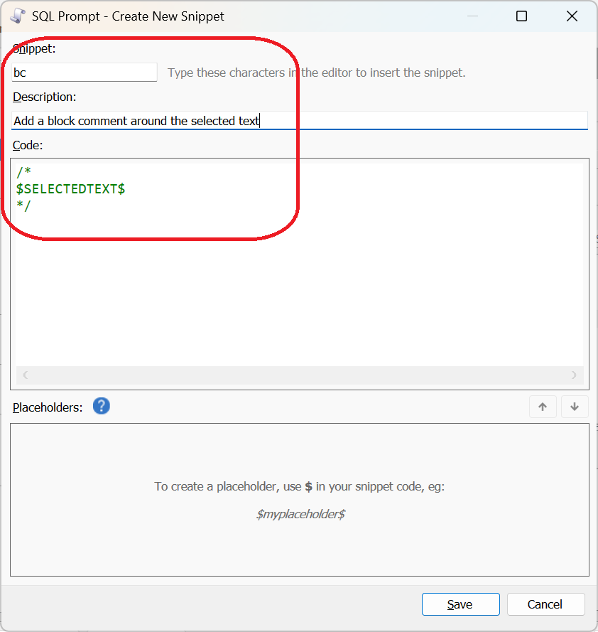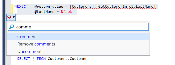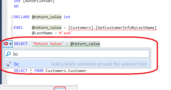 - In your query editor, select the text you want to block comment and then type bc in SQL Prompt's margin prompt.
