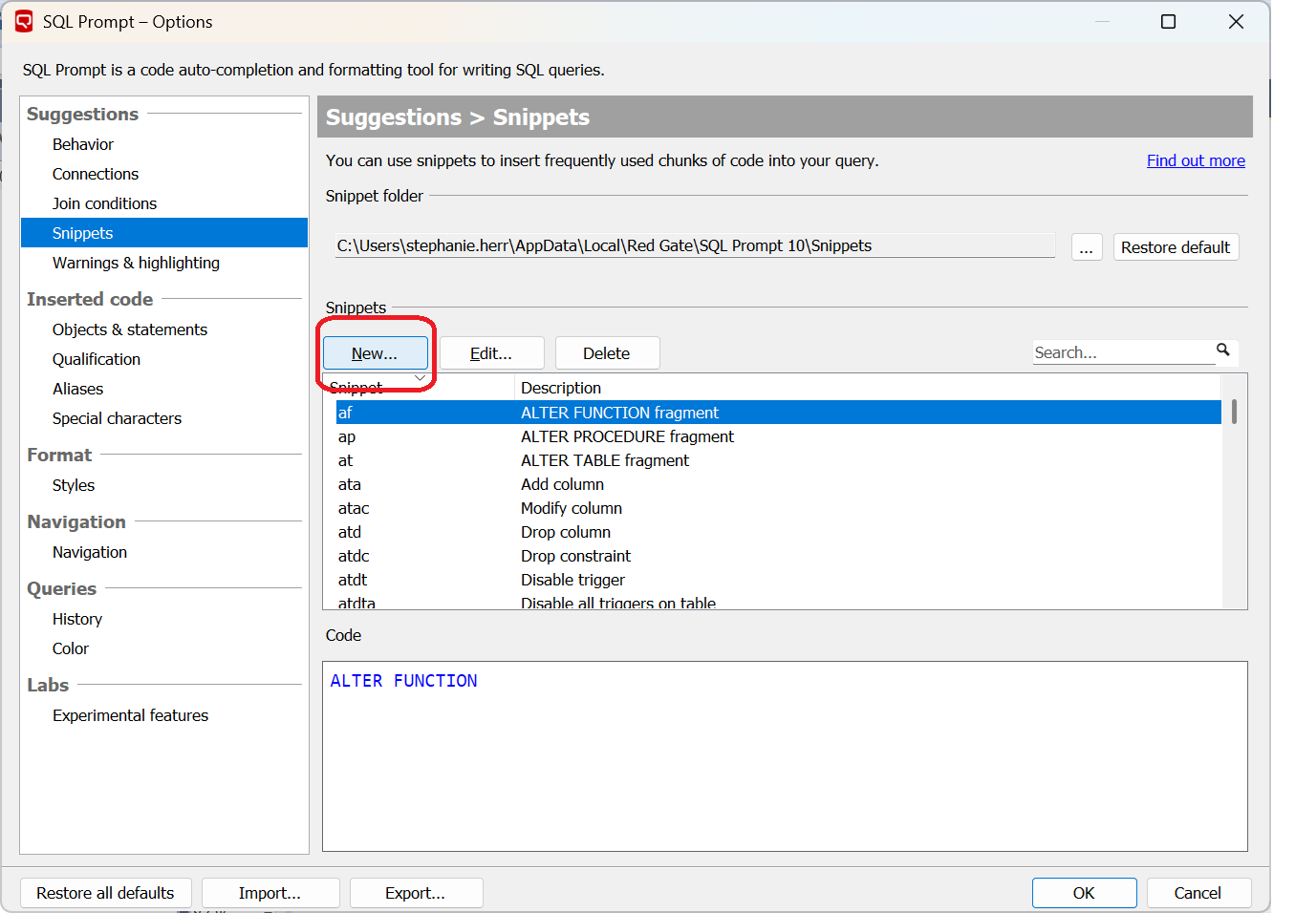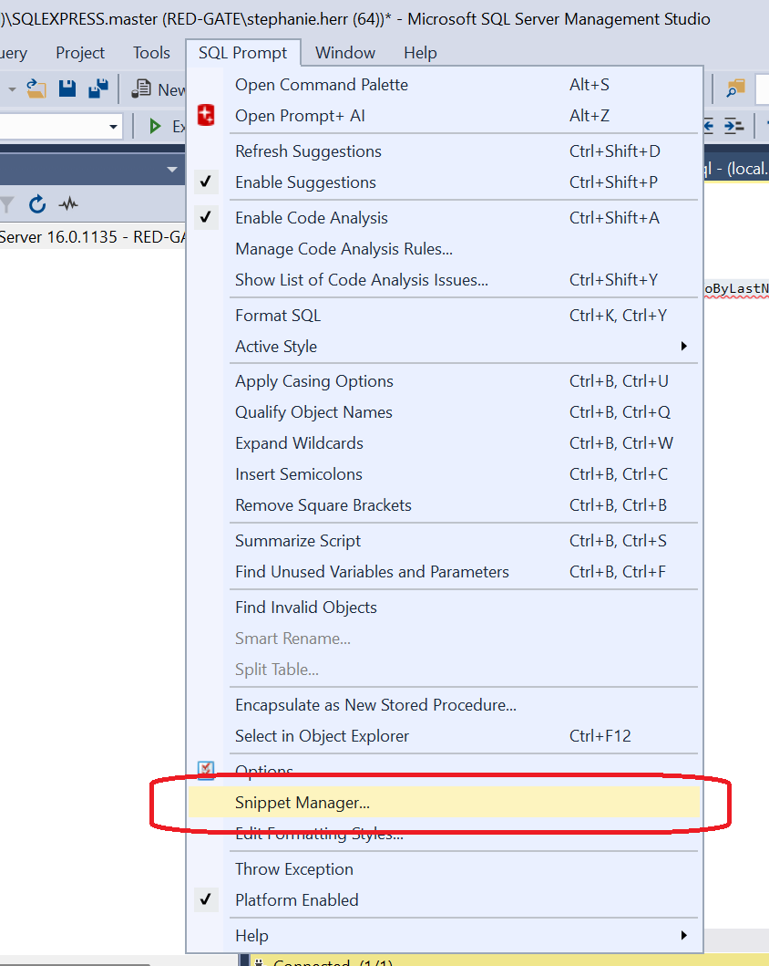 - SQL Prompt is pre-configured with a large number of default snippets. To see a list of all snippets, and to edit, delete or create new snippets, on the SQL Prompt menu, select Snippet Manager.