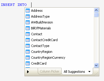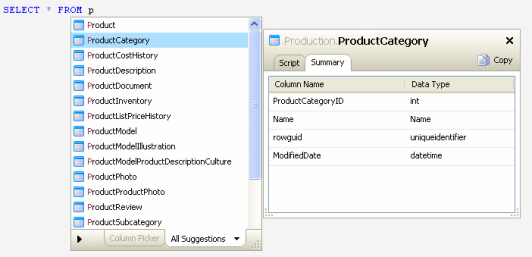 - Use Ctrl + Down to change the category of suggestion (for example, to see only views or stored procedures in the suggestions box).