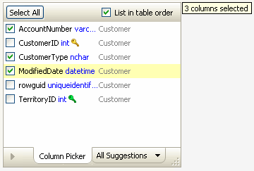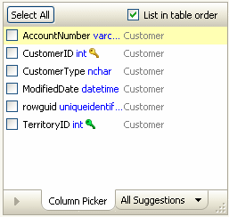 The column picker allows you to choose multiple columns from the table. Primary key and foreign key columns are indicated by key icons. - Use the Up and Down arrow keys to move through the list, then press Space to select a column for insertion. You can also use the mouse to select the check box for each column to be inserted: