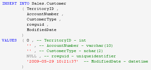 SQL Prompt completes the syntax of the INSERT statement, and inserts the name, data type, and default value for each column as comments: