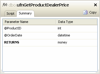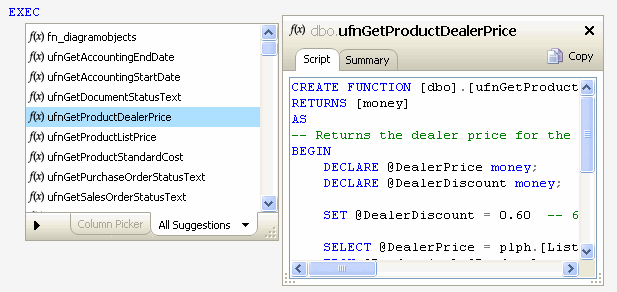 The suggestions box is displayed, with all the functions and stored procedures at the top of the list. Select a function in the list, then click the Script tab to see a preview of the object creation SQL script in the object definition box for the selected object.