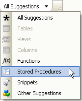 - To see only stored procedures in the suggestions box, click the All Suggestions tab at the bottom of the suggestions box, then click Stored Procedures: