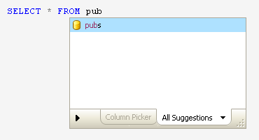 SELECT * FROM pub - SQL Prompt lists the pubs database as a matching suggestion: