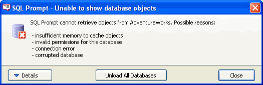 This warning may also be displayed if SQL Prompt has run out of memory to store the objects from this database. See Managing connections and memory.