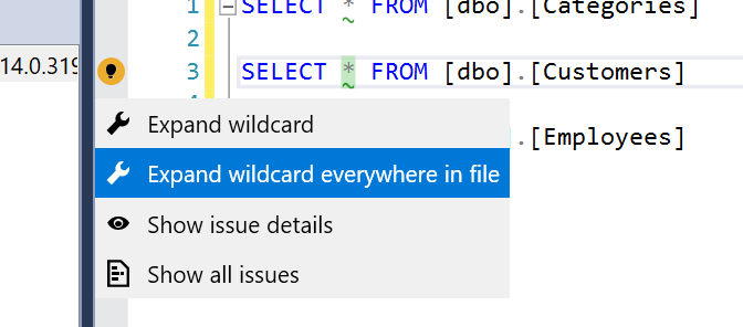 SQL Prompt can run code analysis on your SQL as you type and warn you of any potential issues it finds. For some of the issues detected, SQL Prompt will highlight the error in the editor and enable you to automatically fix the issue using the light bulb in the sidebar.