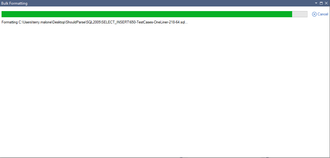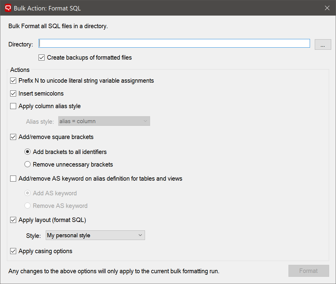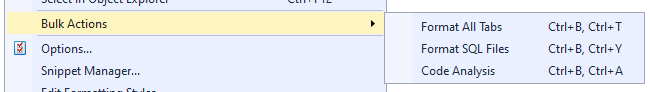 Multiple SQL files in a directory can also be formatted. To do so, open the Bulk Actions menu (SQL Prompt menu → Bulk Actions) and choose "Format SQL Files".
