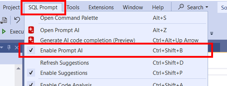 - Click on the SQL Prompt menu and select Enable Prompt AI at the top of the menu.