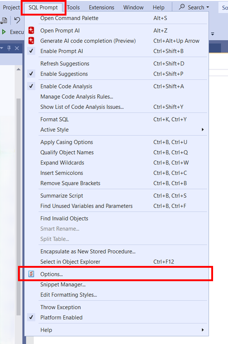 - Click on the SQL Prompt menu and select Options at the bottom of the menu.