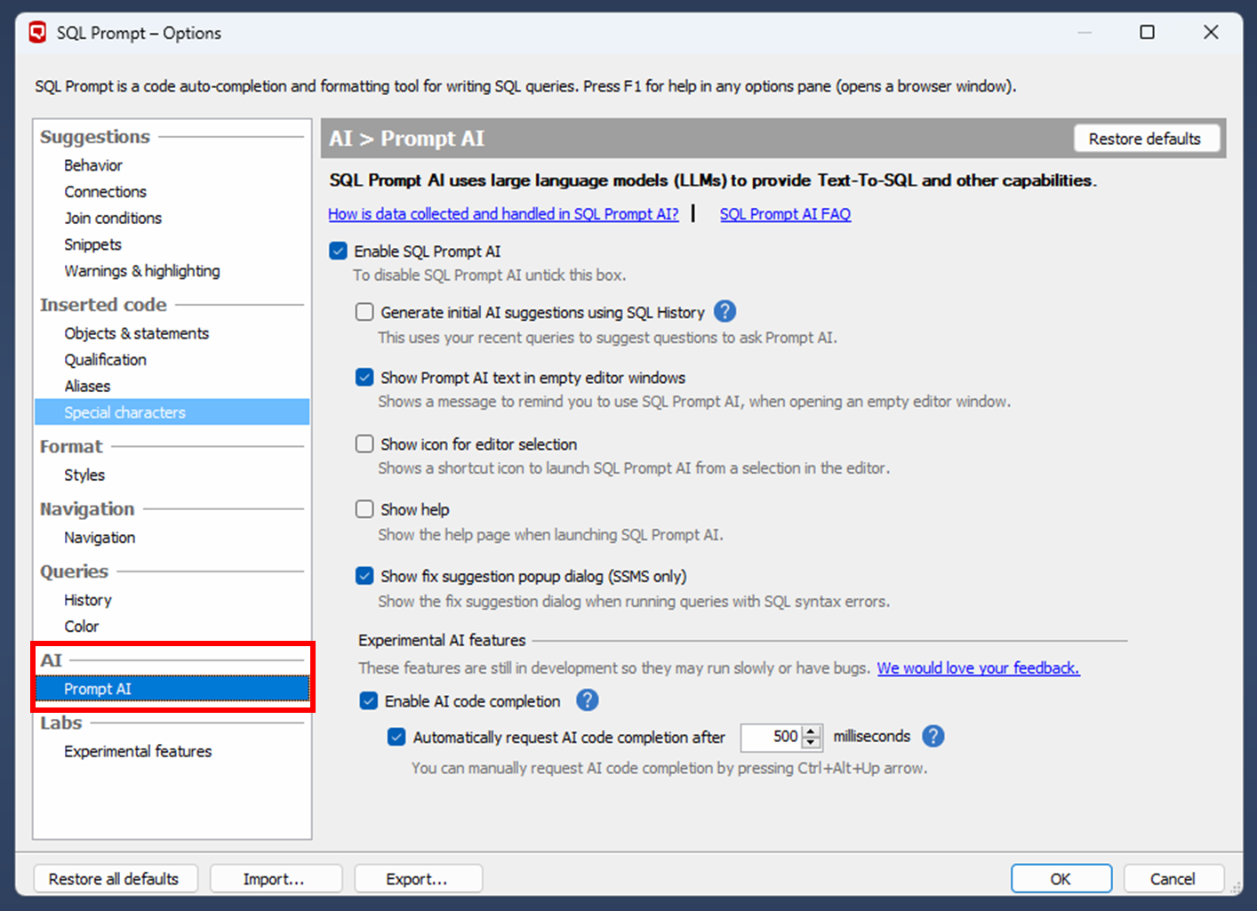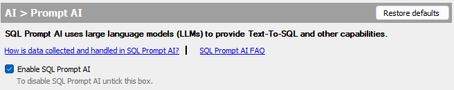 - Tick/untick the checkbox “Enable SQL Prompt AI” to activate or disable it.