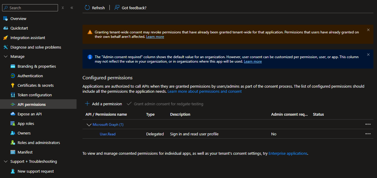 In Azure, this can be managed from the Manage => API permissions tab.