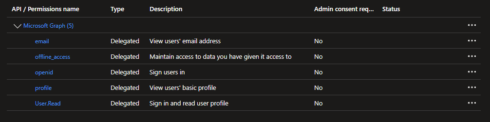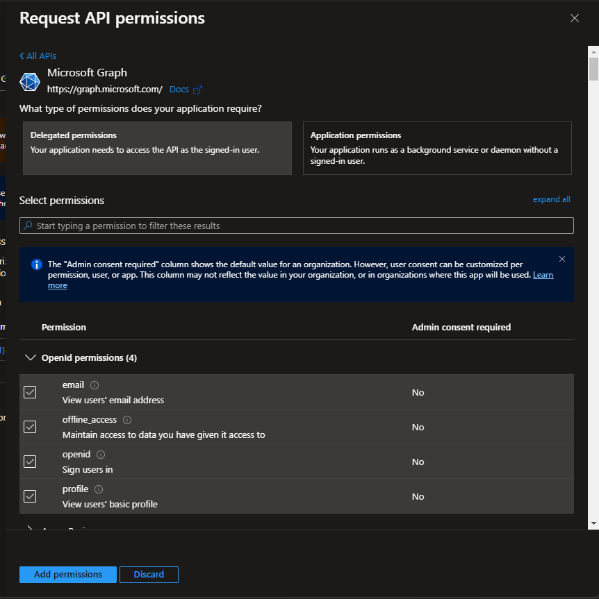You'll need to grant the following permissions: email offline_access openid profile .