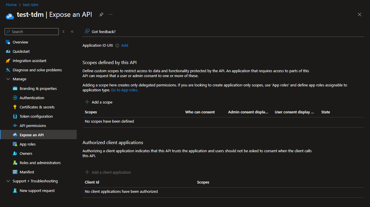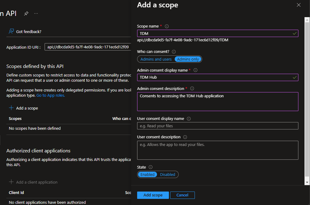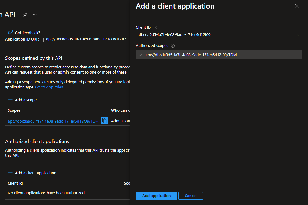 You'll need to set up a new scope in your auth provider for your TDM Application. In Azure, this is known as an App Registration.