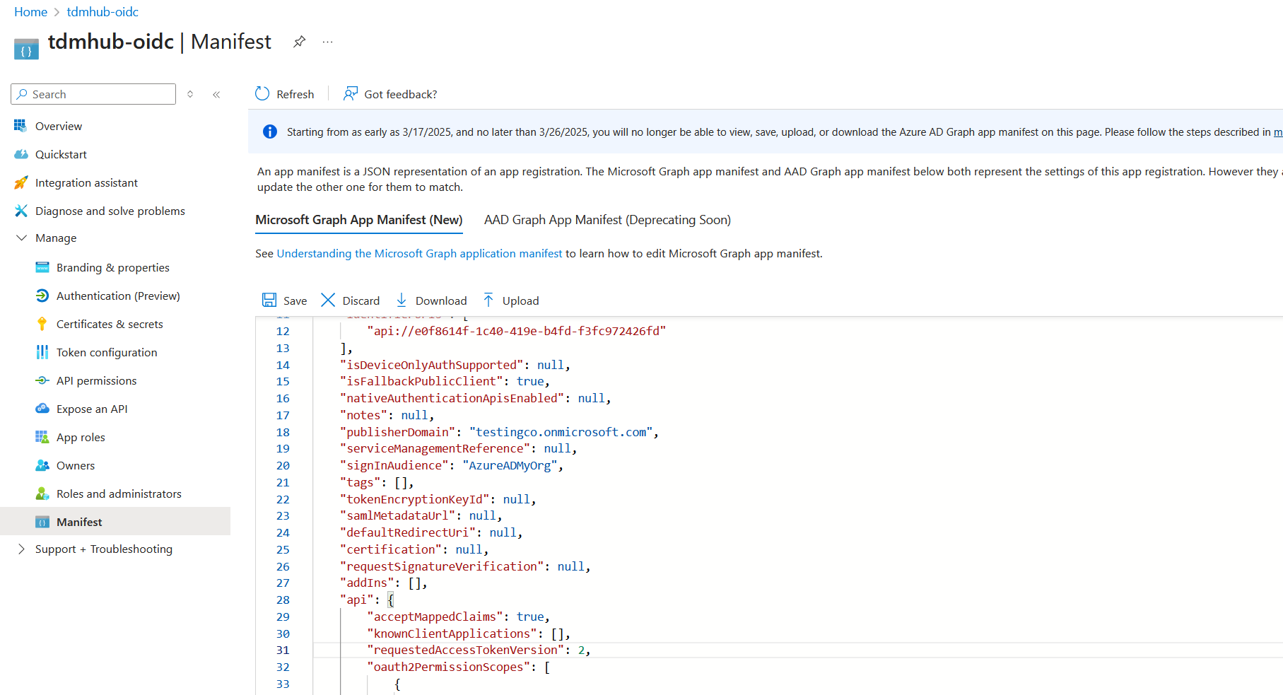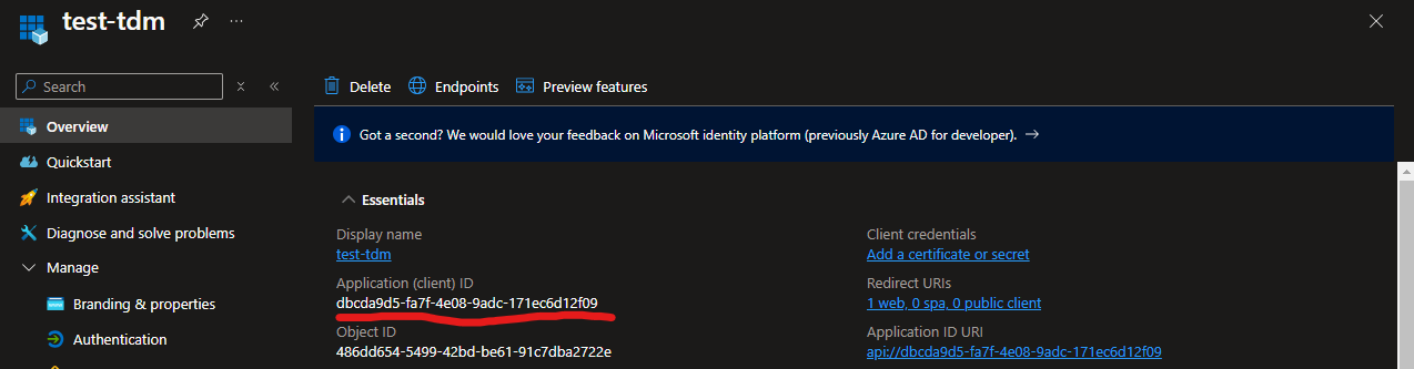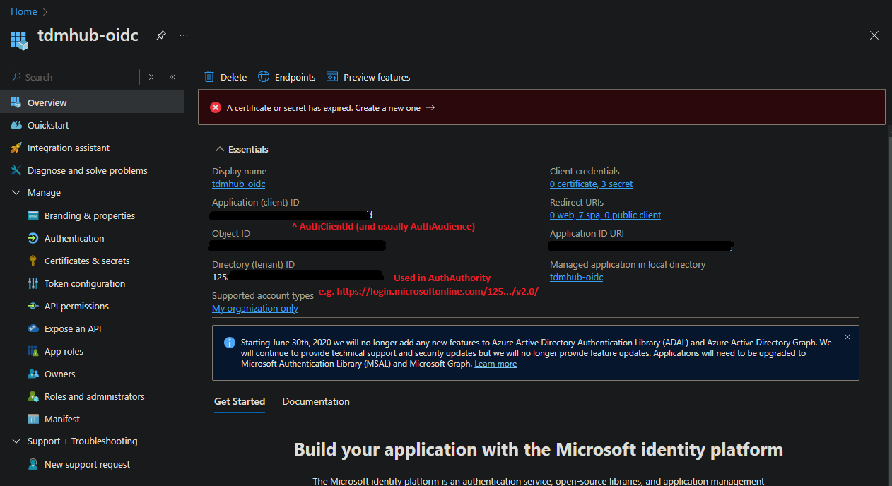This section gives you pointers to where all the values you'll need for your TDM Hub's config.yml are in your App Registration.