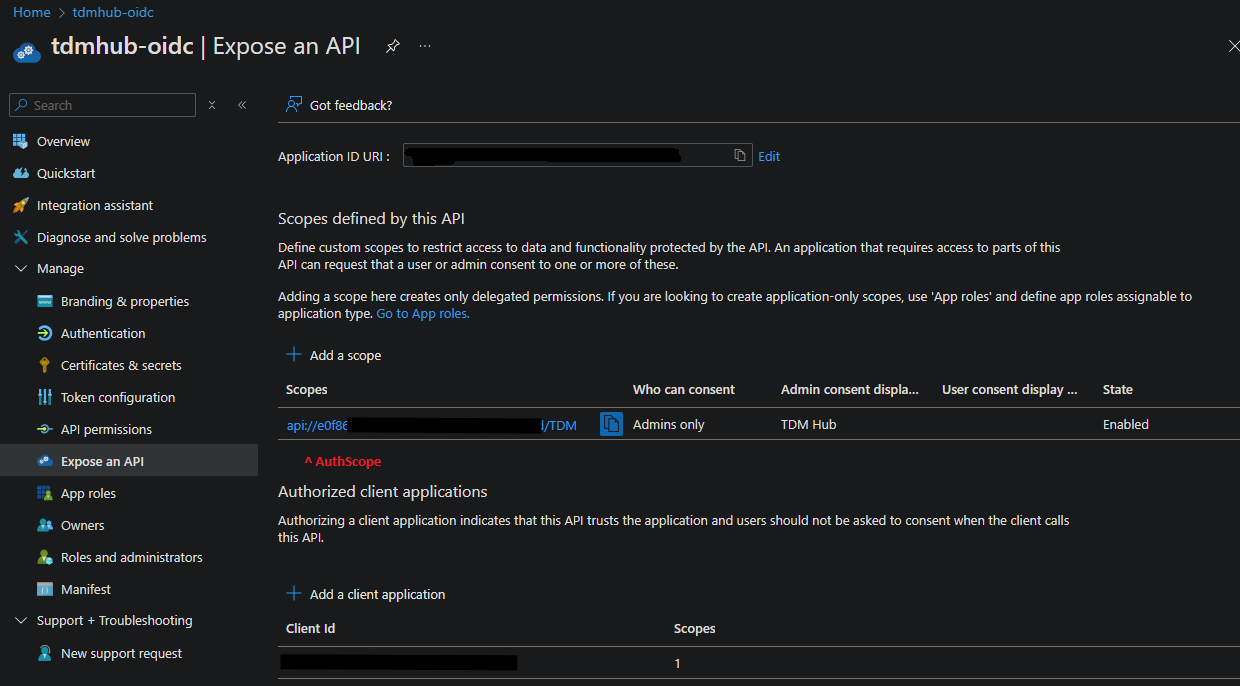 This is the scope you'll set in the AuthScope parameter in your config.yml. e.g. api://dbcda9d5-fa7f-4e08-9adc-171ec6d12f09/TDM
