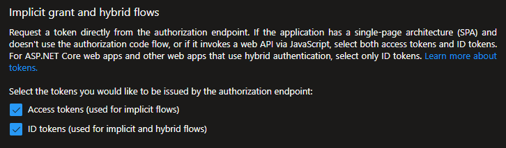 Access tokens and ID tokens need to be enabled. You can do so here in the Manage => Authentication tab: