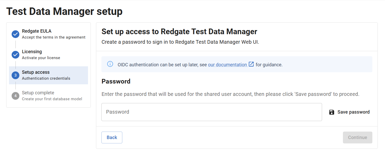 - Set in the setup access step of the Test Data Manager setup page, which appears when starting up the application for the first time:
