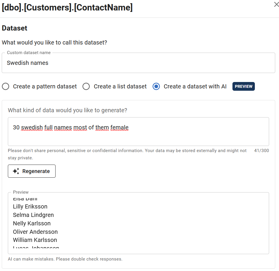 If the built-in datasets do not satisfy your anonymization requirements, you can leverage AI to create custom datasets. Simply describe what kind of values you need and click "Generate". You will be able to review the dataset generated by the AI in the preview window, adjust the prompt and regenerate or save it.