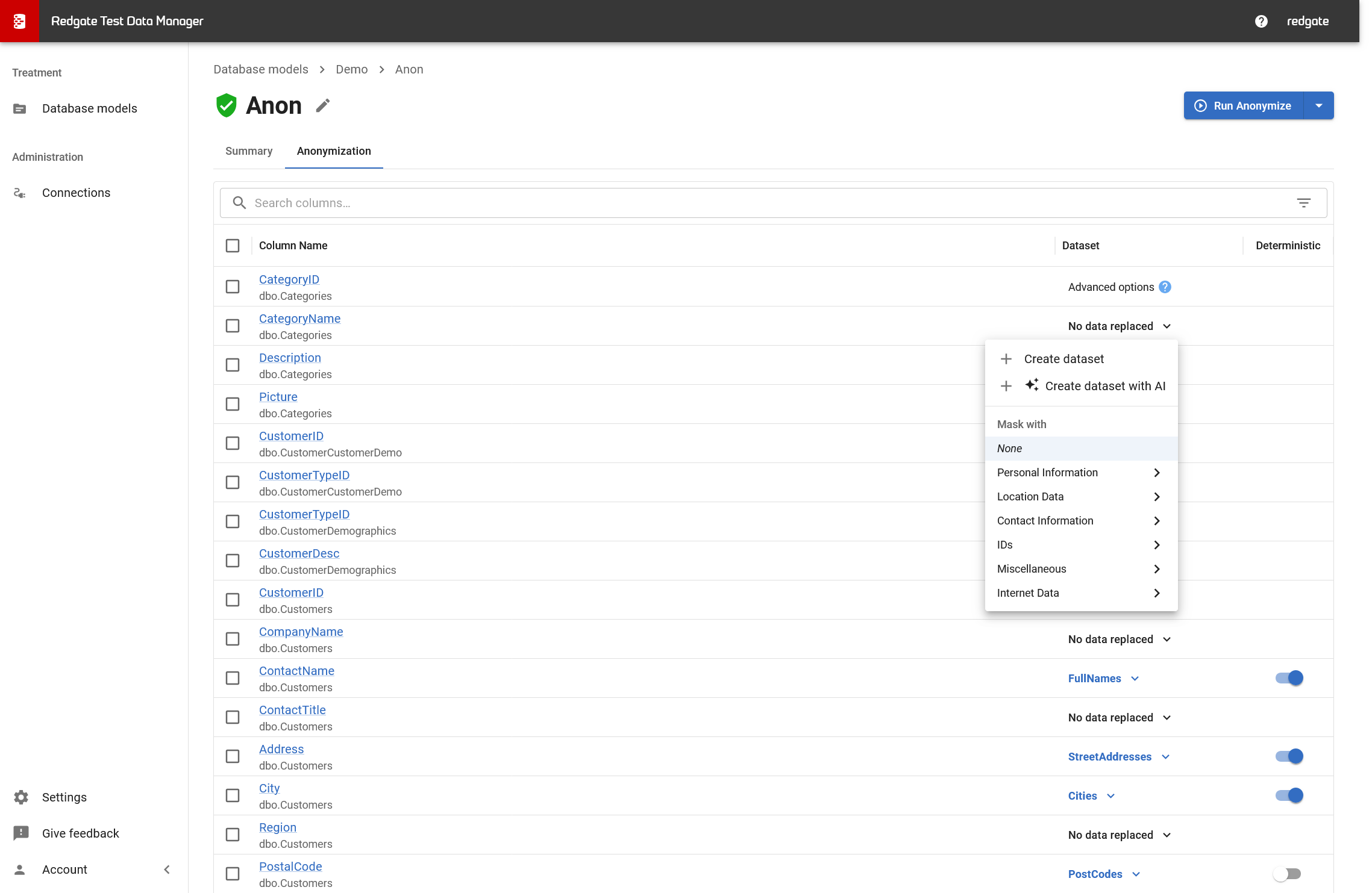 - Find the column in the Anonymization tab