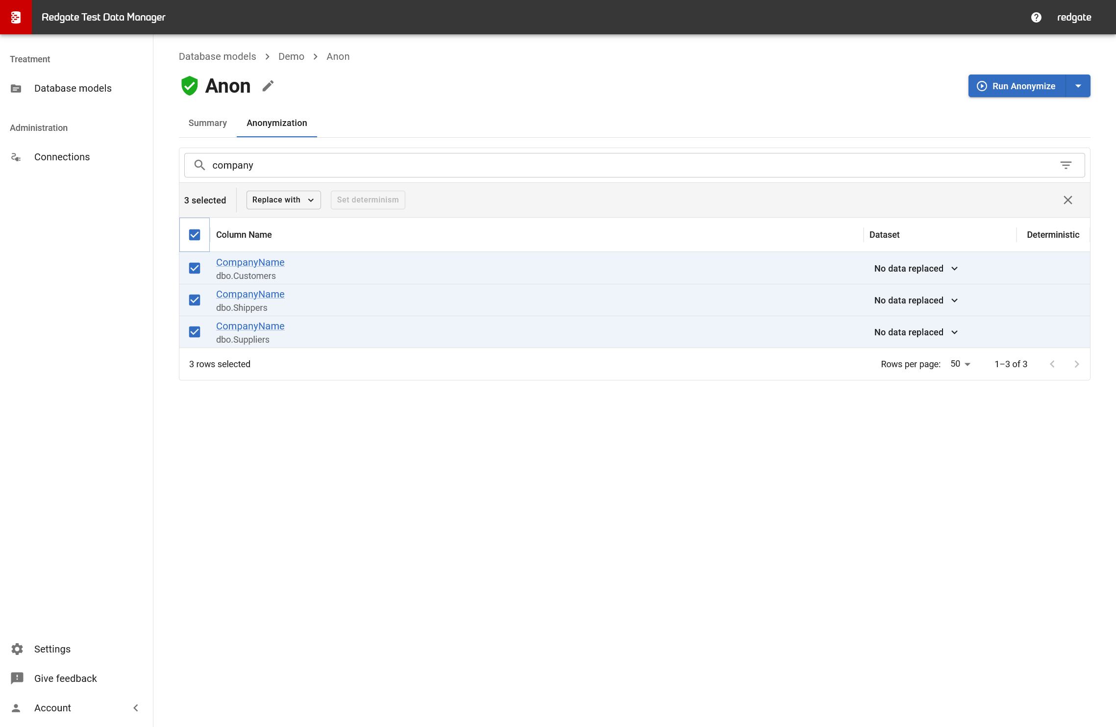 The Anonymization tab shows all columns Test Data Manager identified as containing sensitive data:
