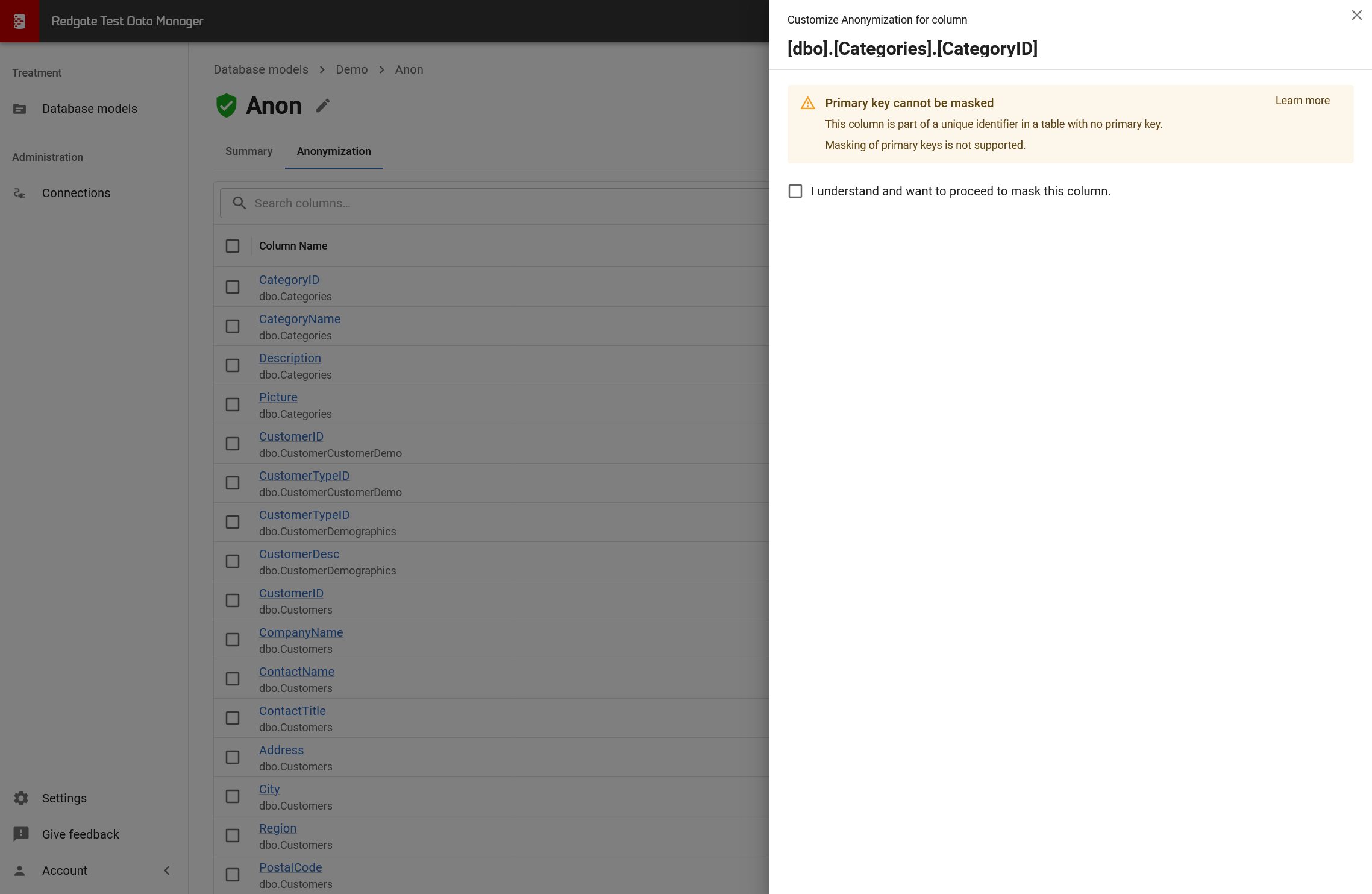 - Check "I understand and want to proceed to mask this column"