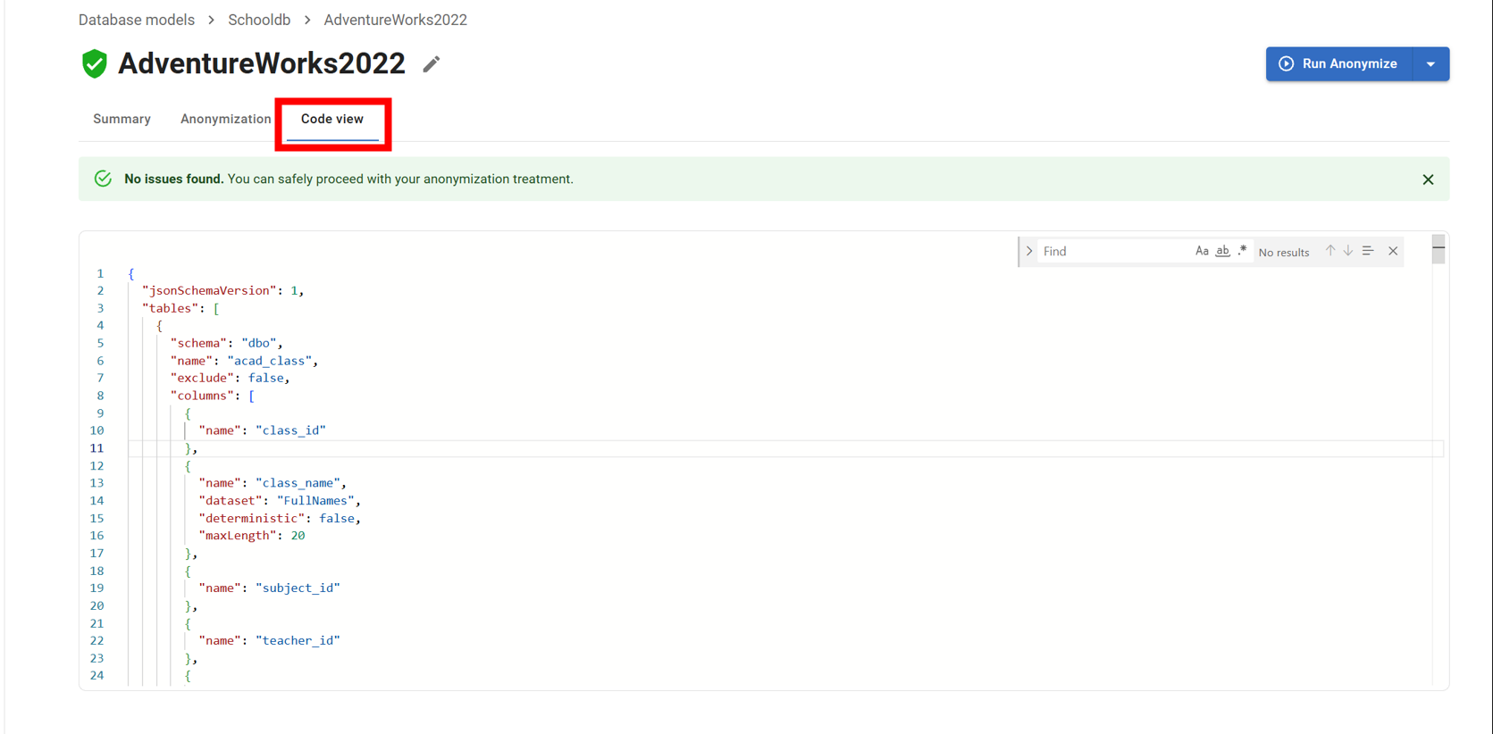 You can switch back to the graphical editor at any point to verify your changes visually. → Reviewing and Editing Masking Rules → Running an Anonymization Treatment