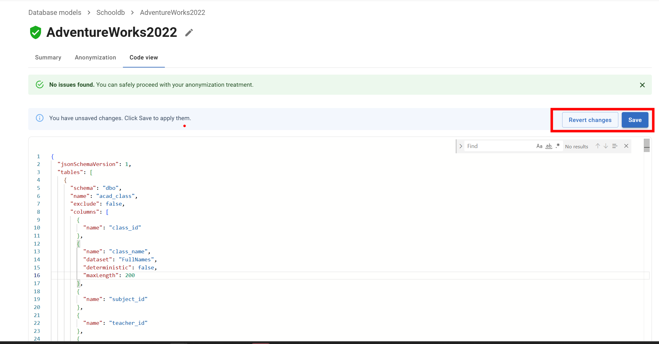 Code View lets you view and edit the masking configuration JSON file directly within Test Data Manager. Instead of editing rules through the graphical interface, you work with the raw configuration file, then save and execute it immediately.