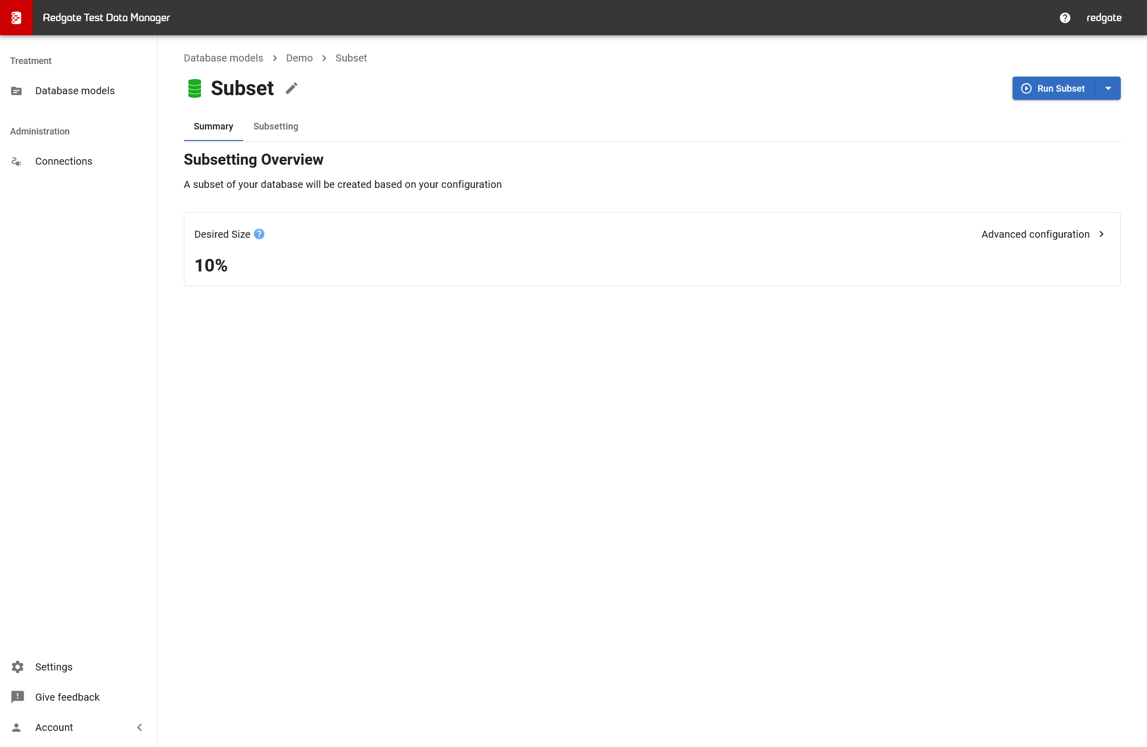 Default behavior: If you don't configure anything, Test Data Manager creates a subset that is 10% of the source database (up to a maximum of 1GB).