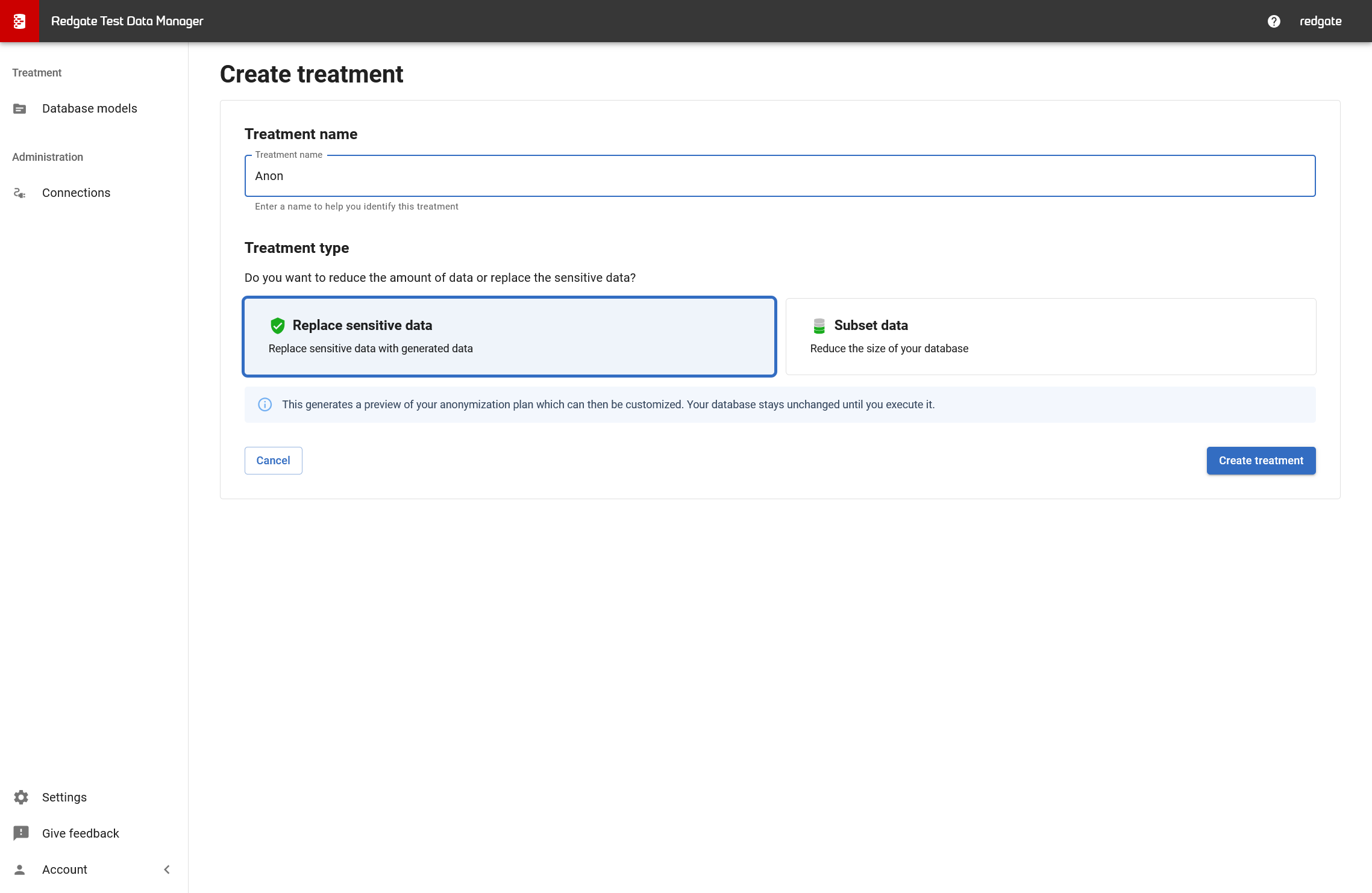 - Treatment name: Enter a descriptive name (e.g., "Customer_Data_Anonymization")