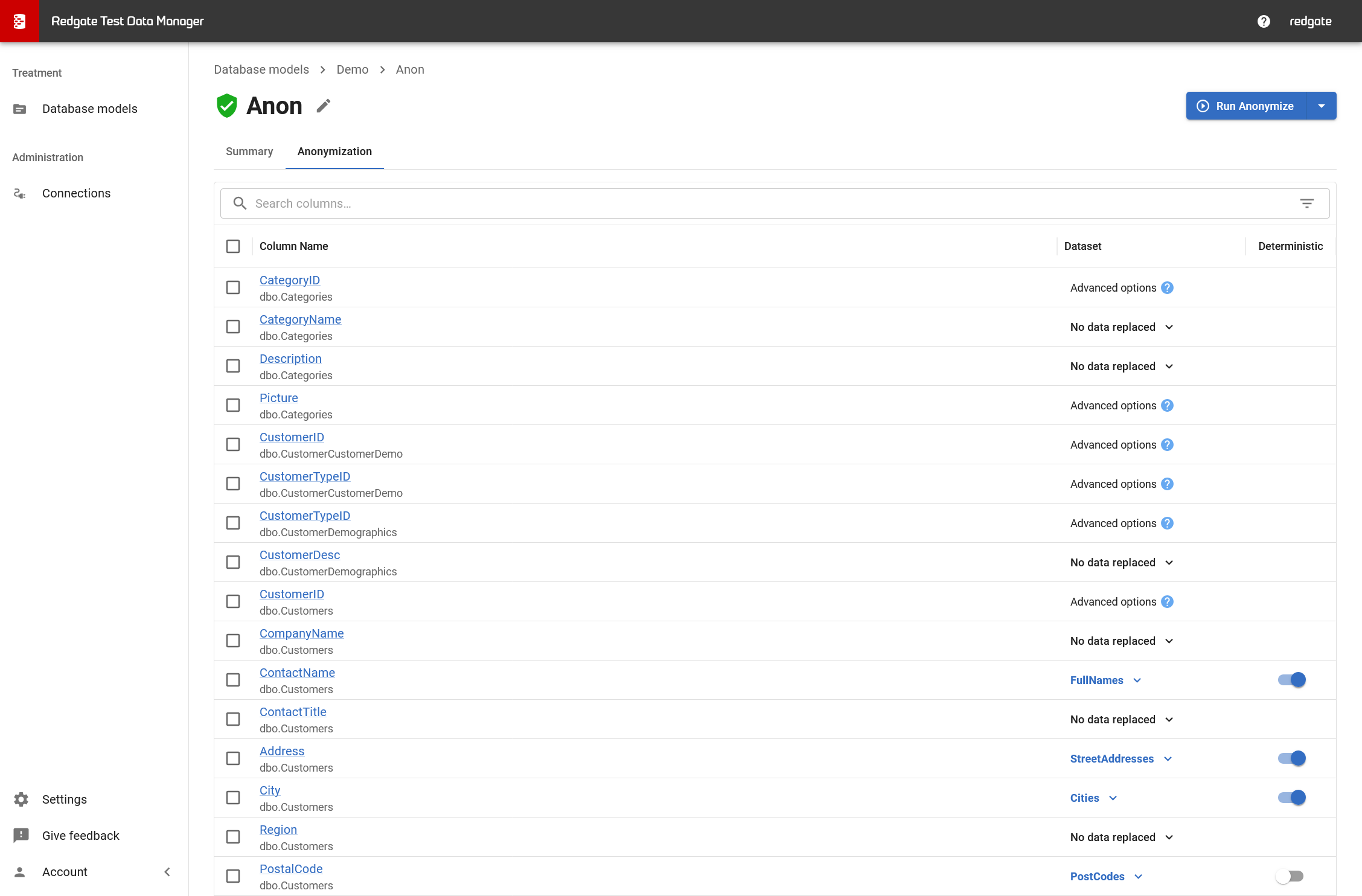 The Anonymization tab shows all columns Test Data Manager identified as containing sensitive data: